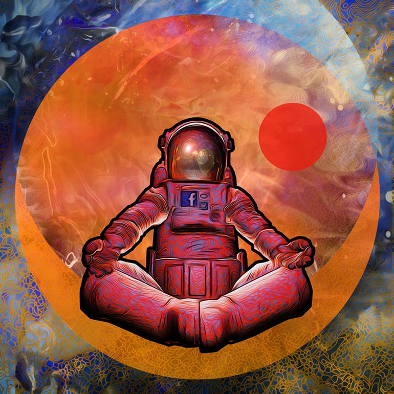 Interactive collage on aluminum with augmented reality (AR) layer selfie stream, 2015 We are the astronaut. Our spacesuits, devices, services, technology. This series uses a free smartphone app (eKo Art). When viewed through the phone, the work reveals hidden content. The AR layer in this series i...