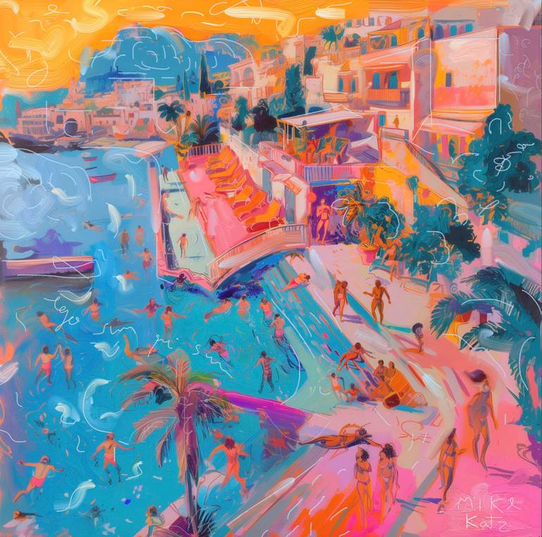 The composition unfolds like a visual symphony: sun-drenched facades in warm oranges and pinks contrast with the refreshing turquoise of the sea, where swimmers and strollers appear as fragments of memory in motion. Gestural brushstrokes, scribbled marks, and layered textures evoke both spontaneity ...