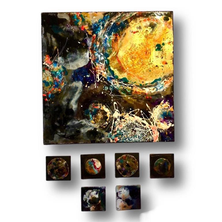 Fantastic multi-panel designer art work is one of a kind. It is impossible to cheat and copy. You can be sure that you have a unique art, the only one in the world. The largest piece (80x80 cm) from this art set is created on a stretched handmade linen canvas. I used metallic and matte acrylic paint...