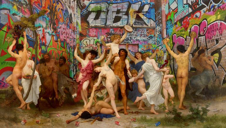 EXPLOSIVE JUXTAPOSITIONS With explosive juxtapositions, artist Marco Battaglini collides the principles of idealistic beauty, as epitomized in Renaissance painting, with the modern anarchic anti-consumerist ideology of graffiti, that espouses the transformative power of defacement. Enormous in scal...