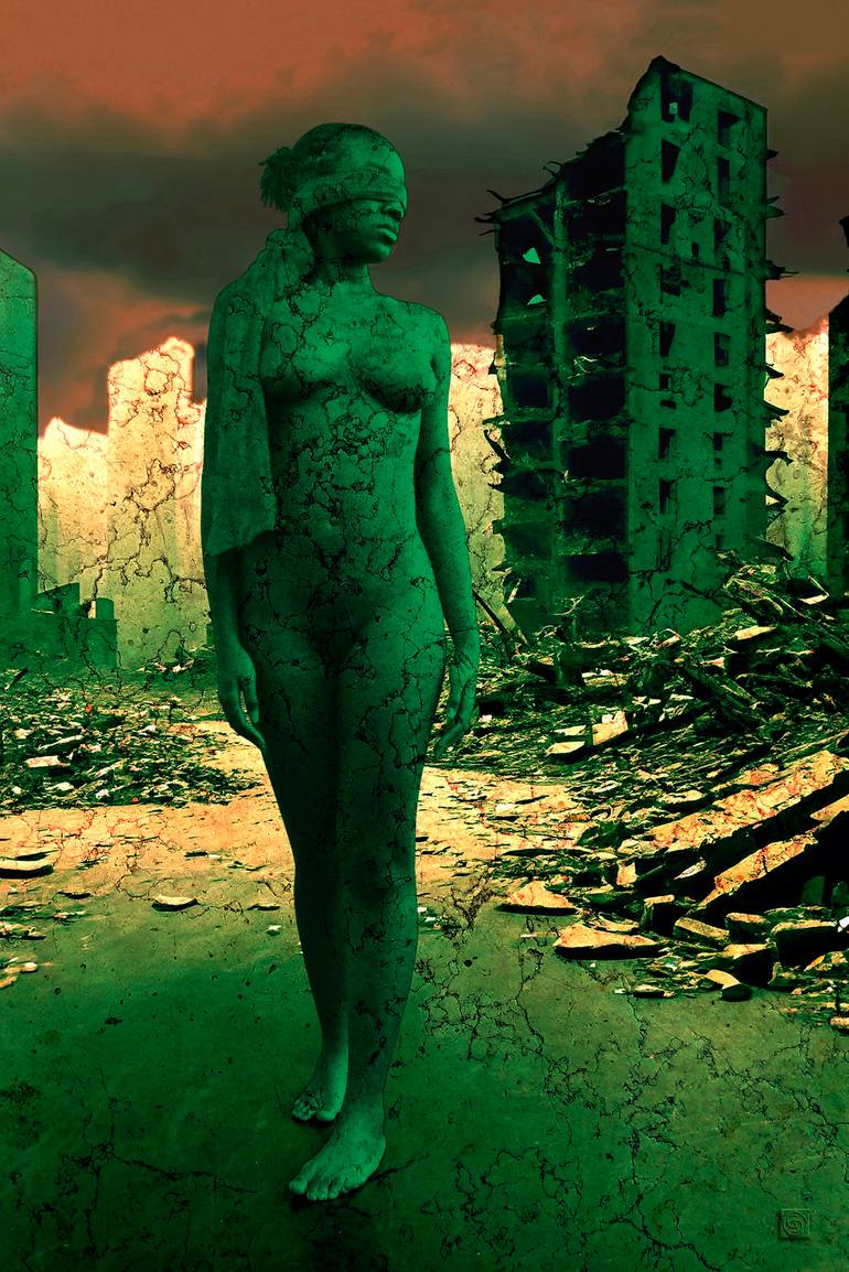 Nemesis, goddess of vengeance, instrument of divine punishment to punish human excess and restore balance. As in most representations of justice, here we find a blindfolded woman, except that she holds neither scales nor a sword in her hands, her very presence being synonymous with a field of ruins....