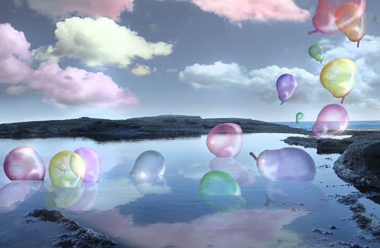 This is a digital artwork from photographs of my pears and Garie Beach, I turned the pears to balloons and they're emerging from the lake. I have two versions of this artwork because my screen recording didn't catch the first creation, so I made it again. About the material it's printed on: This di...