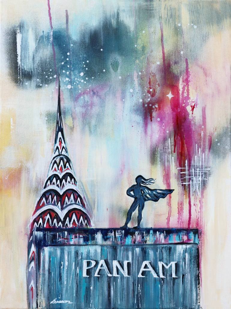 New York moxie I Inspired piece of abstract mid-century modern artwork, reflecting the heart and soul of New York with landmarks Pan Am and Chrysler buildings. This nostalgic atmosphere is imbued with an exciting twist - the presence of a woman who radiates the confidence and valor of a superhero. ...