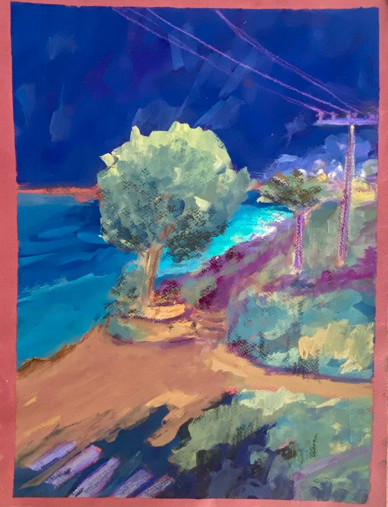 It was night on the beautiful shore of Sdot Yam. In the evening was hot, but then a fresh breeze blew.This work was done on dark burgundy paper with gouache with touches of dry pastel