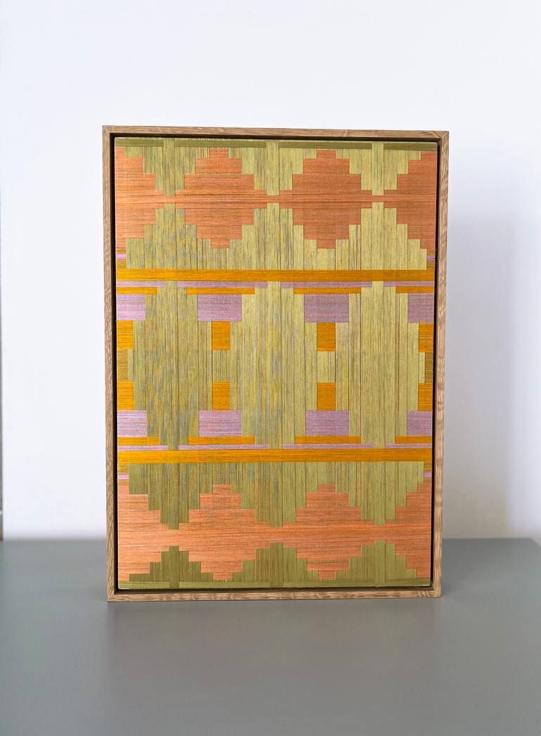 Nowshin Prenon is a textile artist & a hand weaver based in London. She explores the application of colour & form through a refined language of Minimalist abstraction. By playing with threads in different order, she constructs intricate compositions that investigate balance, movement & depth. Her visual language is influenced by her cultural heritage & architectural structures, which she translates into textile pieces. All her material is sustainably sourced and bought from the production waste from mills. She uses waste as a resource to create her pieces.