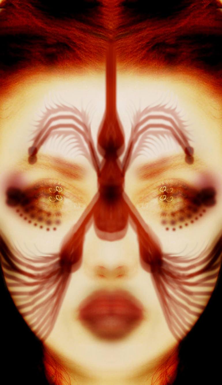 Digital photography, self-portrait, manipulated: I now have a huge, uncanny spider-like bug on my face which is either an external object or part of me.