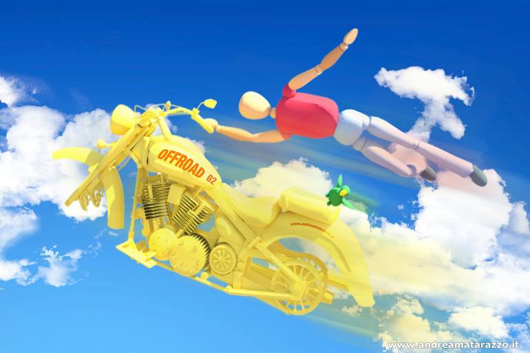 Fly with me ! Very Free road ! On the wings of fantasy! Surreal and ironic image . Computer Graphic 3d 2d.