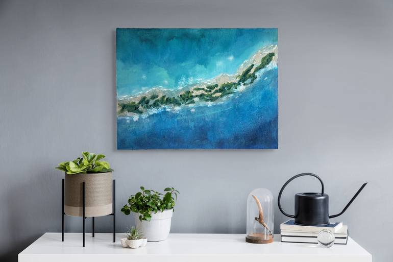 A larger-scale mixed media piece at 24x18", this textured painting resembles an island in the middle of the ocean. Made from layers upon layers consisting of gesso, AJ's custom texture paste, sand, gravel, acrylic paint, and even plaster, "On An Island in the Sun" is a part of AJ's "Reach Out & ...
