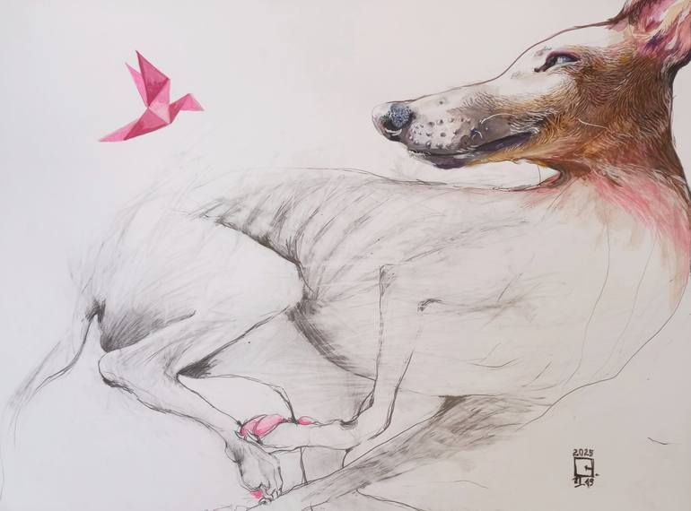 "Her beautiful mixed-media paintings find the middle ground between art and illustration, providing the viewer with endless enjoyment and interest. In many of the artworks, Olga keeps her colours nicely muted and calmly toned, to create a soothing effect that beautifully emphasises the naturalistic elements of her work. She pays an incredible amount of attention to the anatomical details of the animals she represents, ensuring that each creature is skillfully and accurately captured. Her work has a peaceful feel to it, created by the wonderful subject matter and glorious palette. In this collection, fishes swim happily, horses smile or watch the world go by and a group of deer scatter in the falling landscape. Each image is perfectly coordinated with the ideal colour to bring out the glitter in the sky or the twinkle of an eye. Every detail is highlighted and shown in its best light, each toothy smile or playful glance. The creatures are the stars, but the painter brings out their best. In some of my favourite paintings, a group of birds watch the flood, safe in the knowledge that they are free from harm. The swimming blues cascade together and contrast stunningly with the dashes of red and yellow. The form of the birds in the foreground opposes the twittering masses flying away. In other works, hares are caught out in acid-coloured washes that turn them from cute animals into blazing pop-art icons. Horses share a whisper and talk amongst themselves about issues that humans couldn't possibly understand. In Gal's world, birds and rabbits are present at political gatherings and cows and cats know secrets and communicate in their own special language. I think these delightful works would make a great gift for an animal lover, or would equally be at home in a café or restaurant anywhere in the world. With a lightness of touch that makes them so special, their quirky energy would light up any room and provide a buyer with years of happiness."