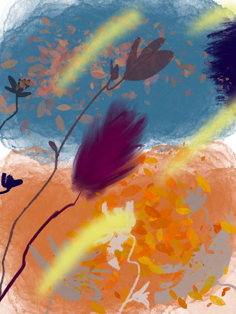 Natalie Ola is a brand name of an artist living and working in the Helsinki metropolitan region of Finland. She creates out of the comfort of her home which allows her to stay close around her three beloved children, as well as enjoy a large water pond area and massive starling murmurations over it right in front of her studio windows. Natalie works with acrylics, oil pastels and charcoal, as well as digital medium Procreate. Her works aspire to be alive with color and movement, echoing the textures and rhythms of urban life—layers of spray paint, vibrant colors, and bold brushstrokes—yet juxtaposed with organic motifs like flowers, leaves, and animal forms, which weave through the compositions like nature reclaiming its space in the chaos. Natalie is a self-taught artist that dreamed of painting early in her childhood as an outlet for deep and intense emotions. The need to create peace has always been a priority. Natalie says, “I aspire to paint concepts. The concept of partnership— how the two or more grow together, shaping up the strengths in each other and becoming more like each other while maintaining strongly defined boundaries and identity. The concept of hacking the ecstatic— it involves mending and spreading the bliss over the areas that had been previously shattered, covering and healing them, thus amending and rejuvenating the mind. The concept of rediscovering and reconnecting with the deepest of our values; perseverance in reinforcing them. A special tribute to nature—breathtaking, powerful and wonderful, often under-appreciated nature that provides its healing and restoring powers on demand, nonstop.”