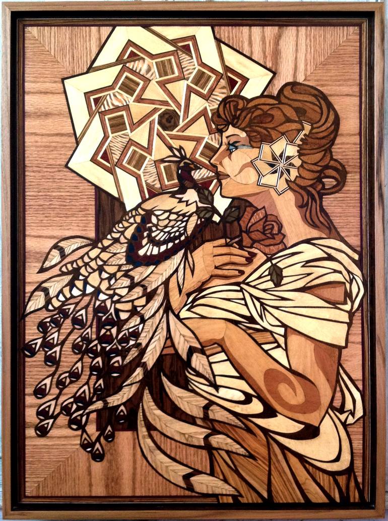 This artwork is inspired on the illustrations of the great artist Alphonse Mucha and belongs to a series which is still being developed. Every little piece of this artwork is made with wood veneers, most of them natural and very little pieces of dyed veneers. The beauty of this work lies in the fa...