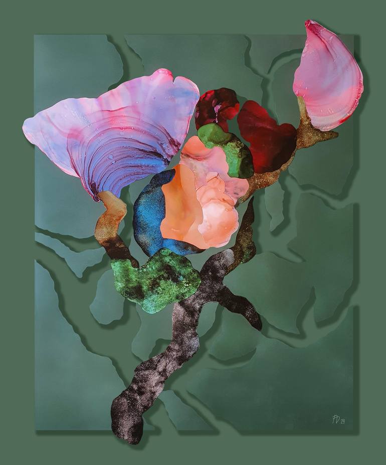Ariadna Dane (b. 1984, Siberia) is a visual artist working across traditional and digital media. Primarily self-taught, she has developed her practice through further training in Contemporary Collage and Creative Development at Central Saint Martins (London). Ariadna’s work has gained international presence, exhibiting in the UK and beyond. Her distinctive pieces are held in private and corporate collections, including notable hospitality and media brands. Ariadna’s upbringing in Siberia and her travels fostered a deep connection to nature that continues to shape her practice. Inspired by the intricate forms and textures found in nature, Ariadna translates these often-overlooked details into evocative ecosystems of forms that interact, dissolve, and reassemble: reflecting nature’s cycles of creation and decay and blurring the line between the tangible and the abstract. The artist’s latest work marks a shift from observing nature to embodying it as a metaphor for the human experience. Using plants as a symbol, the series speaks to resilience and vulnerability: bending, breaking, healing, and growing — just as we do. Short poems accompany each work, acting as entryways into the emotional terrain of the image and offering a moment of reflection for the viewer. Ariadna’s practice spans traditional and contemporary techniques, combining her signature cutouts, hand-cut elements and digital layering to create artworks that invite contemplation of both the seen and unseen.