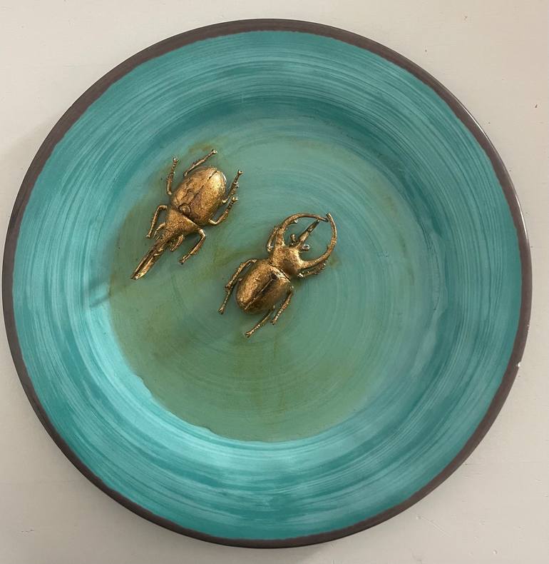 A turquoise plastic plate, round with 2 gold plated rubber coated insects. This work of art is part of a series of plates dealing with the connection between food and art. ready to hang.