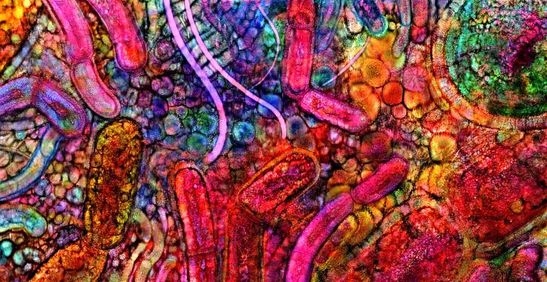 Abstract microbiota image showing bacteria and other microbes that live in the gut and contribute to health and disease. Glowing and vibrant and seething with life.