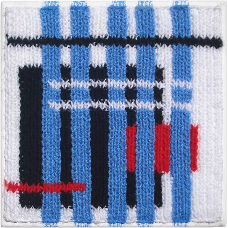 This artwork features a tightly knit composition mounted on canvas, skillfully combining both material and technique. Knitted using acrylic yarn in a palette of red, white, blue, and black, the piece creates a bold and structured pattern. Vertical blue lines dominate the canvas, interrupted by horiz...