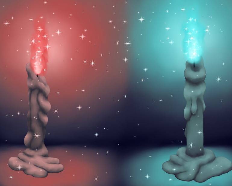 Red and cyan candles. This is a study of colours and the the contrast between light and shadows. Digital artwork done at 300 ppi, high quality print on photo paper (nine colour). Matte laminated, can be provided without laminate or with gloss laminate if necessary. Ships in a tube.