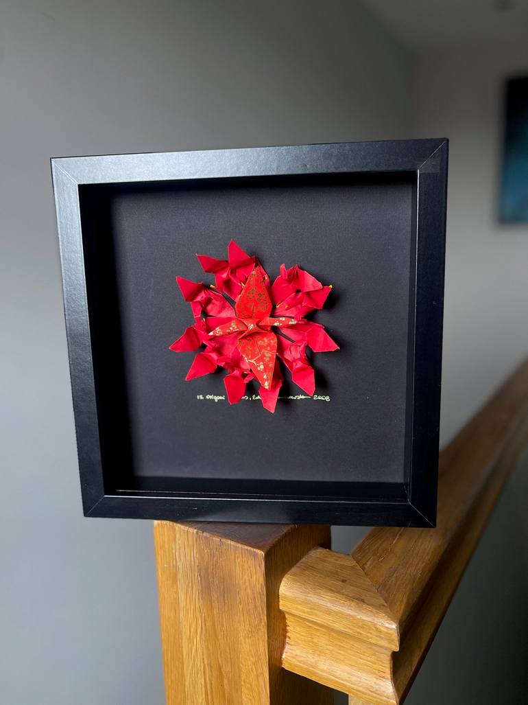 12 red paper origami folded cranes with one bigger bird in the middle of the circle. Each bird was painstakingly created by folding a square piece of Japanese paper that measured 5 cm by 5 cm. After then, the cranes were organised so that they resembled a flying formation by being swirled together i...
