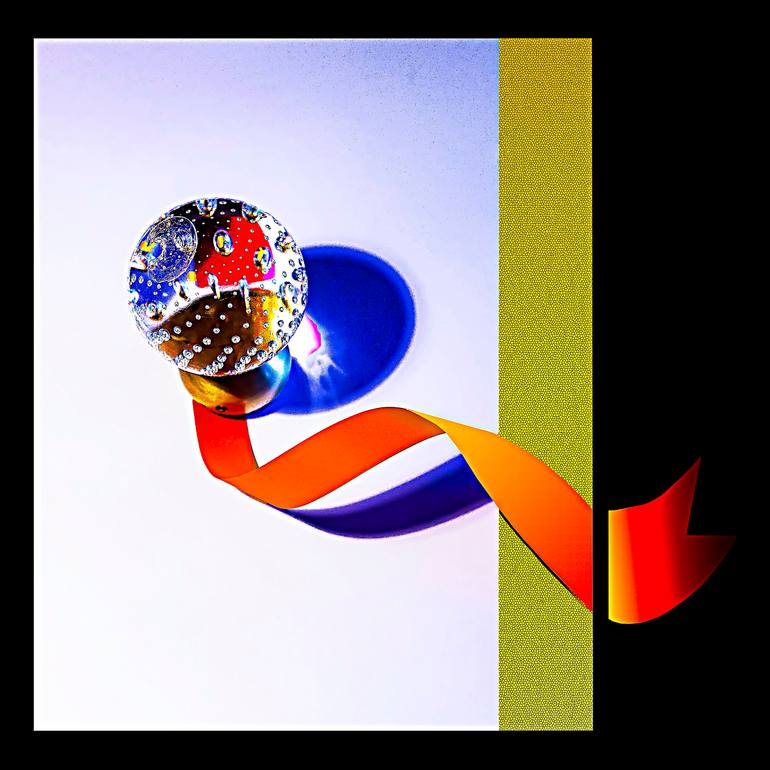 A glass sphere filled with colorful patterns and bubbles casts a vivid blue shadow on a white surface. A flowing red ribbon curves elegantly from the sphere, adding a dynamic contrast to the composition. For sale as Limited-Edition of 30 Fine art prints on Metal H 80 x W 80cm $ 900 - plus shipping. ...