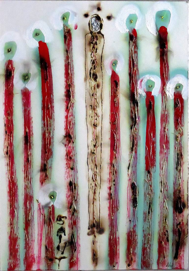 The Beauty of Burning In ABBA’s work, burning becomes both sign and language. Within this chimeric and hypertrophic figure, soot rises to a spiritual substance — a residue, a testimony of an existence that burns. Matter itself becomes memory, a reflection of a personality long consumed beneath the surface. The artist invites a suspension: one feels gently led into a muffled, weightless space, where thought and body drift between dream and trance. It is a pop and dissonant world — that of contemporary society — which demands that human beings react, or pretend to react, to the endless wars that surround them. In this fragile, interior landscape emerges a slender figure, a semi-empty shell, almost a mask — a symbol of invisible struggle, of an intimate confrontation with oneself. ABBA’s pictorial research seeks a beauty that hurts: an incomprehensible, elusive, painful beauty. His canvases, scarred by burns and voids, narrate a mark that changes and twists but never disappears. It is an existential déjà vu repeating endlessly, an obsessive movement that multiplies the self into countless reflections, all trapped within the mirror of the subconscious. Through the reworking of images drawn from media streams — computers, television, social networks — the artist composes a visionary catalogue of humanity in decline. Faces and bodies are deformed, scorched, emptied, until they become relics of contemporary consciousness: fragments of humankind dissolving into its own representation. The origin of this poetics stems from a single image: the shadows of vaporized bodies imprinted on Hiroshima’s walls. Immaterial remains of erased presences — silhouettes burned by the explosion — become the visual echo of surviving souls. In them, ABBA recognizes the paradox of survival: disappearance as the ultimate form of memory. Within his language, fire holds a central role — both destruction and rebirth, erasure and testimony. It is the artist’s primal gesture: a flame that burns the surface, yet becomes the very medium through which life transforms. In fire, everything is consumed — and everything is revealed.