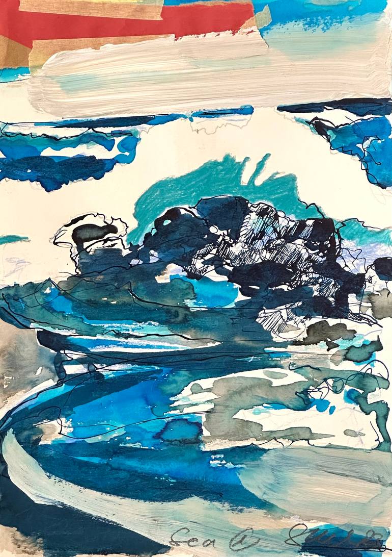 A gestural drawing captures the sea with dynamic energy, using black ink and dip pen—lines and hatching create texture and movement. Ink brush in various shades of blue brings the water to life with depth and fluidity. A turquoise colored pencil area defines the background sky. A collage of brown pa...