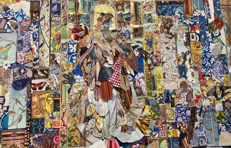 This mixed media piece is protecting the viewer from darkness. It is the sort of piece you need to stop and look at to pick up on all the beautiful details. Rich colours and soft textures bring comfort and peace, but “Sacred Mosaic” is in motion. Determined and fierce, the paper mosaic around the fi...