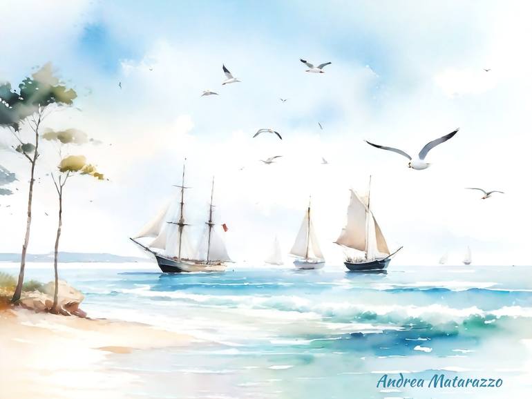 A romantic seascape with sailing ships and seagulls, in a bright environment. Computer graphic with paint effect, between the traditional and the modern