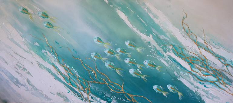 A modern, textured artwork of vibrant school of fish, accented with shimmering gold leaf. Featuring coastal blues and white tones, it embodies a sleek, beach-inspired contemporary style.