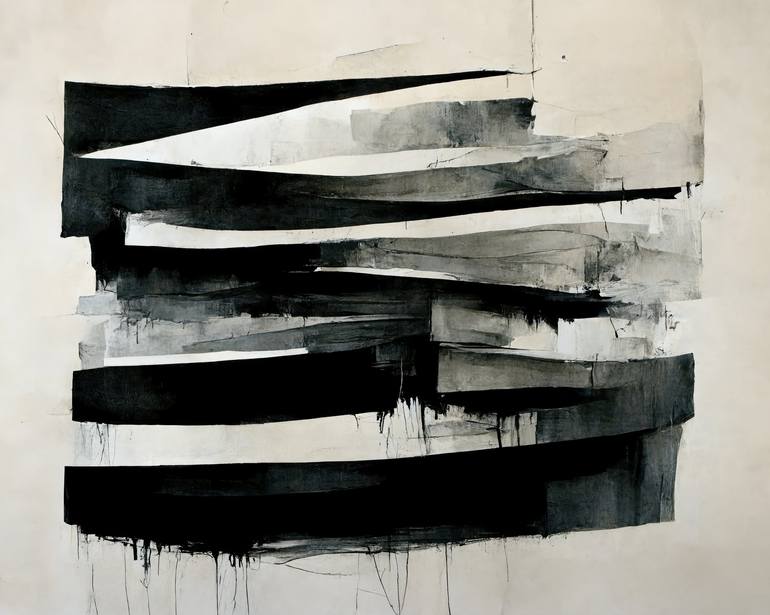 "Scratched Lines 3". Channeling: Black strokes from left to right, black strokes from right to left. Dynamic transformations of grayscale shades. Some drips dissolve, some drips are flowing. Framed by emptiness and surrounding space. -- The piece was created digitally using the most advanced tool...
