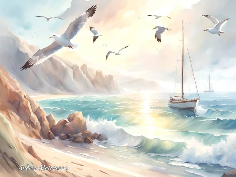 A bright, romantic seascape, with the sun on the sea, with sailing ships and seagulls in flight. Computer graphic, painting effect.