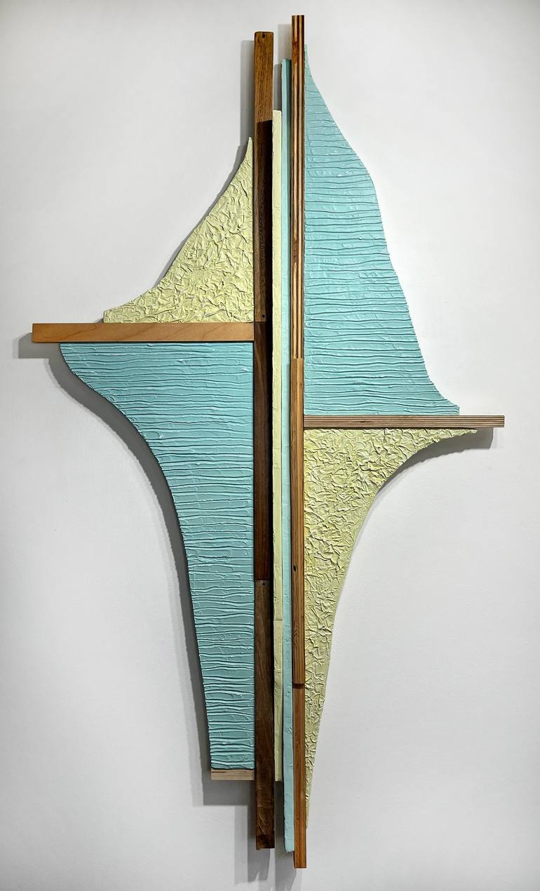 This wall sculpture is made with salvaged wood, foam board, papier-mâché, plaster and acrylic. The plaster is tinted to these colors and texturized. Ready to hang with cleats. Architecture and design are important structural influences in my work, while the movement and life force of the body prov...