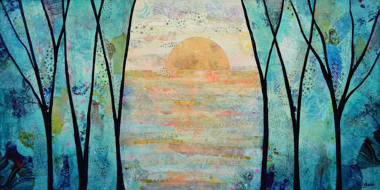 Secret Sunset A magical, secret sunset shimmers over a lake. The delicate scene appears as you peek through a forest of barren, quiet trees. The original is created with layers of collaged paper with shimmering metallic accents. 24"X48" on Gallery Wrap canvas