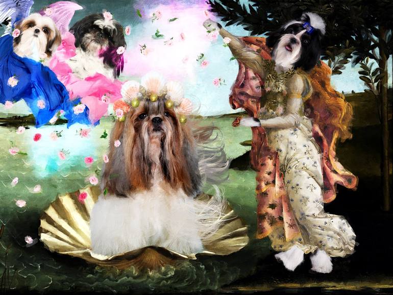 Shih Tzu Dog Artwork inspired by The birth of Venus Sandro Botticelli, famous Italian Renaissance Masterpiece.