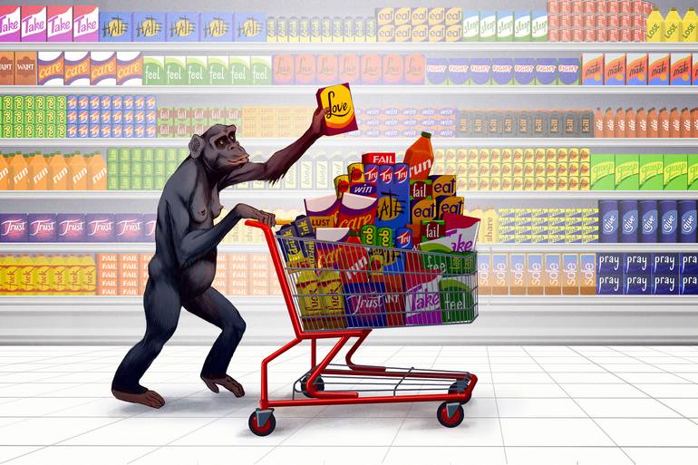 A female monkey pushing a shopping cart, taking some love off the shelf
