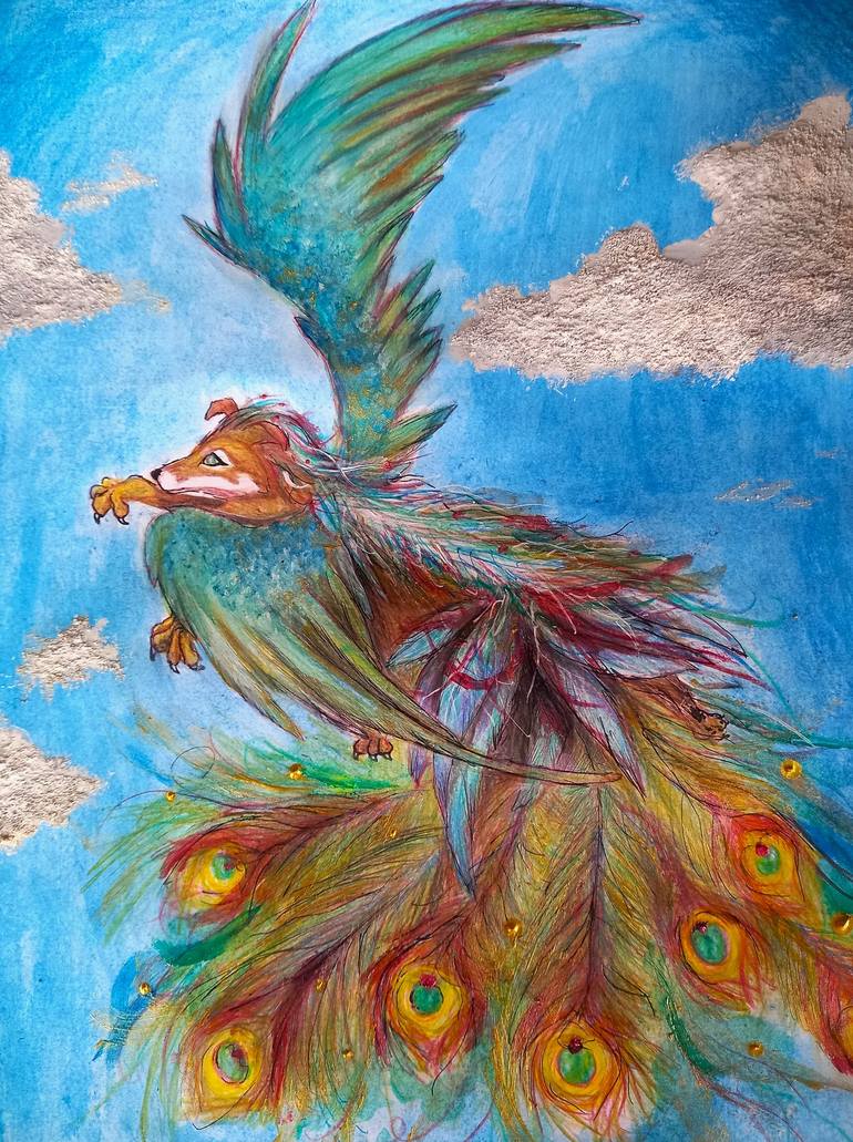 The Simurgh is a wolf-like bird from Persian mythology, representing benevolence, royalty and wisdom. As old as time, it has seen the destruction of the world three times! Notice that the clouds are made of sand in this art