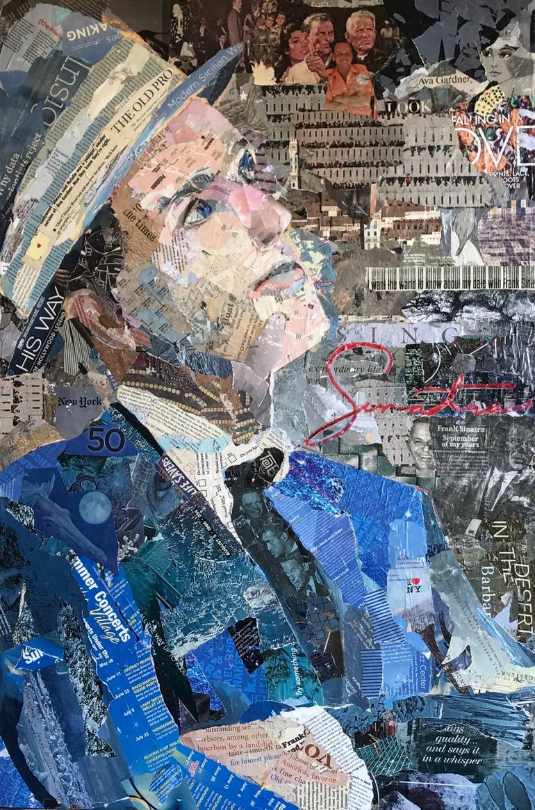 Frank Sinatra was my parent's favorite singer so I grew up with his music. To this day, we listen to him all the time. He is timeless, iconic, and simply the best. With my torn paper collages, I am able to insert text or pictures that represent the subject. You might see a picture of Ava Gardner or ...