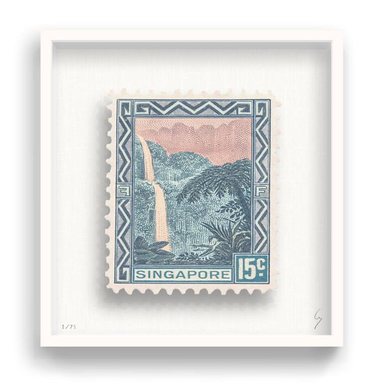 Years spent refining the collection, Gee has curated a selection of postage stamps from around the world. The postage stamp, invented in England in 1840, revolutionised global communication. All nations quickly adopted the concept making it their own. As the first form of mass media graphic design, each stamp tells its own cultural narrative, celebrating everything from commerce and innovation to art and agriculture. Gee spends hours searching for each stamp, often going through thousands before finding the one that will fit into the rest of the collection. The 100-year-old miniature hand engraved artwork is then enlarged and digitally revised by Gee, creating a fresh contemporary take on the original. Finally, the stamp is printed on 350gsm G. F. Smith card, cut out, and finished by hand.