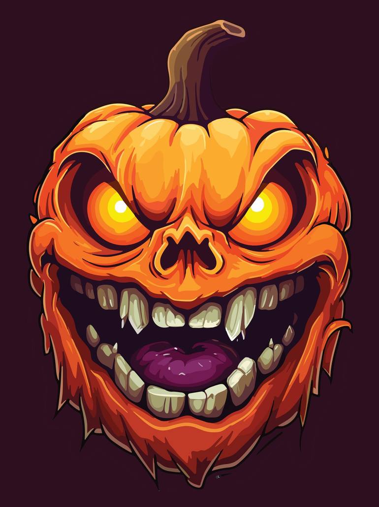 Unleash the eerie charm of Halloween with "Sinister Grinning Pumpkin Head." This intense design features a menacing, toothy grin on a carved pumpkin, radiating malevolent energy. The exaggerated, fiery yellow eyes seem to glow with mischievous intent, adding a bold contrast to the deep orange hues o...