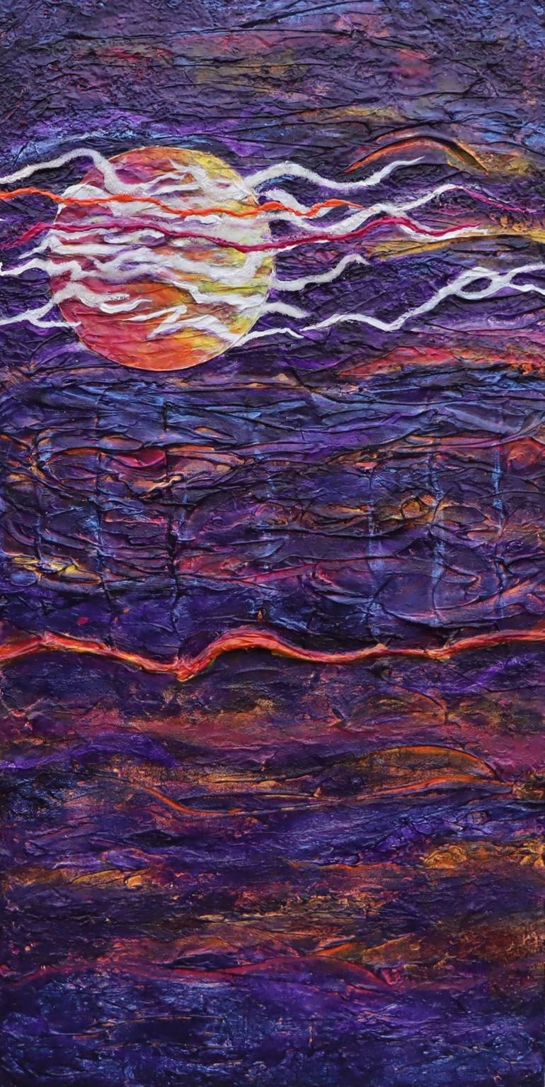 "Solar Storm" is a stunning, high-texture abstract artwork. The deep texture and color continue around the three-inch deep canvas. Fluid lines intertwine, creating the beauty of movement and turmoil. Swirling purple, magenta, orange, and iridescent effects enhance the visual impact. "Solar Storm"...