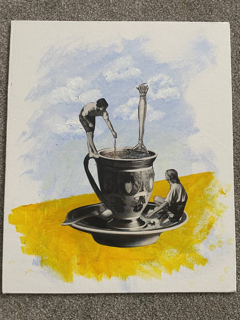 Many people in the world find coffee time special as its the time when they sit down and share their life with others. This piece is inspired by that. It has painted acrylic with original collage and added glitter int he coffee for extra spark. One of pieces.