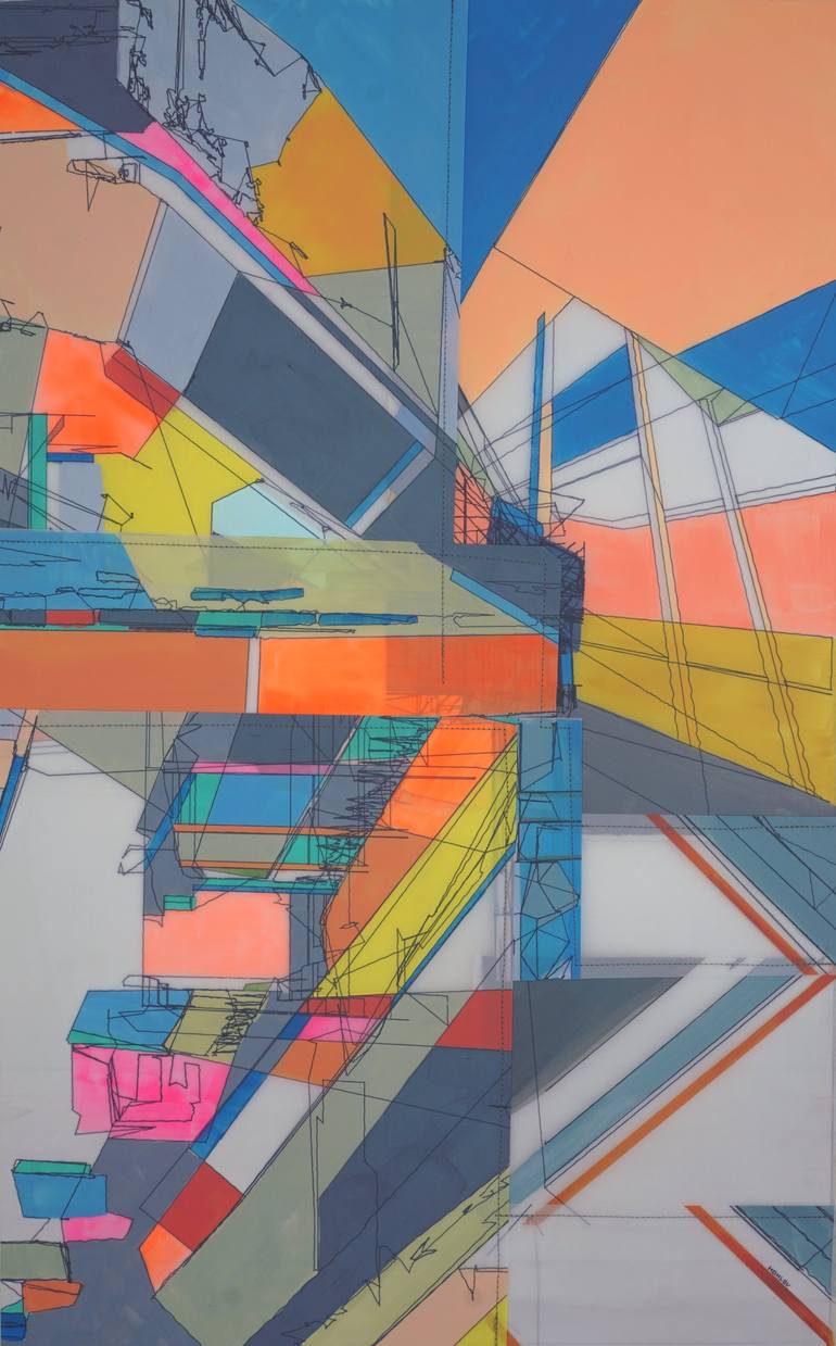 The artwork takes a deconstructive approach using geometric shapes as its main visual elements. These shapes are methodically taken apart and then reassembled creating the foundation of the composition. Incorporating elements reminiscent of a cityscape such as bridges and architectural forms, the pi...