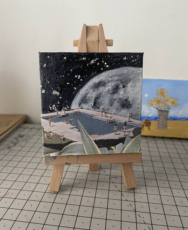 Small canvas original mixed media on 7x7 cm canvas. Signed at the back. Acrylics and vintage photos used to create it. Glitter for stars