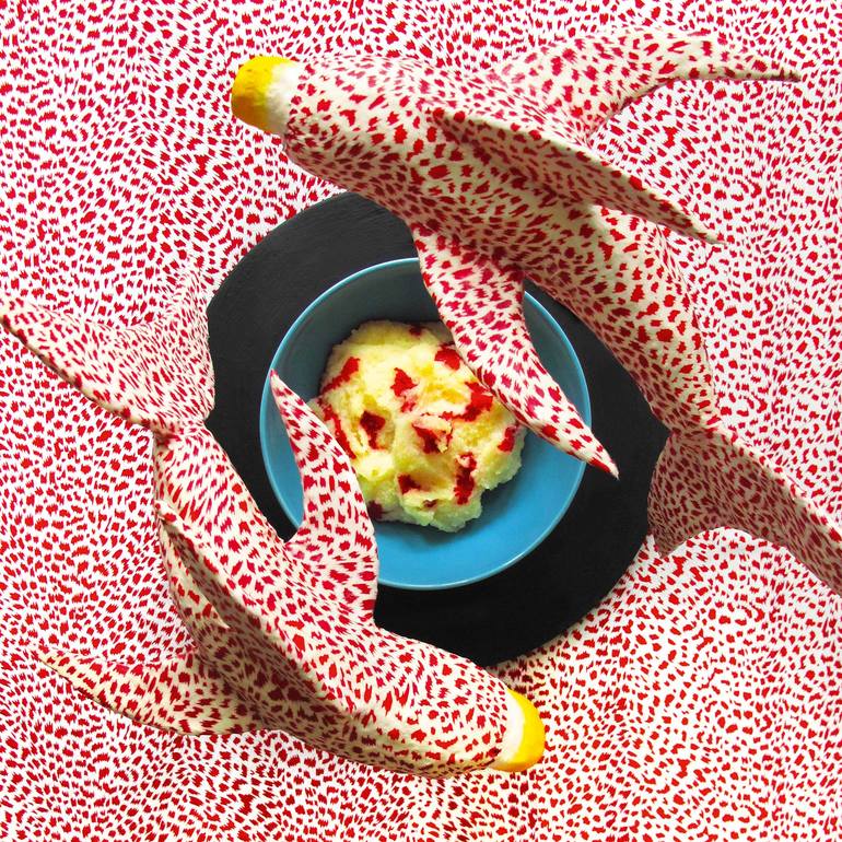 This is a photography of a an object I did. Two fish turning around a bowl of cream of wheat. Their skin is dotted fabric. Their body is handformed and pressed newspaper.