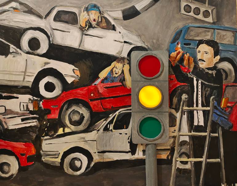 The object is made of canvas, a wooden subframe,3D printed hands, mechanism that manually moves the hands. As a default, Street Lights switch to green-yellow-red every 10 secs. Tesla’s hands can be manually moved by the mechanism installed on the side of the subframe. If hands are moved apart and wi...