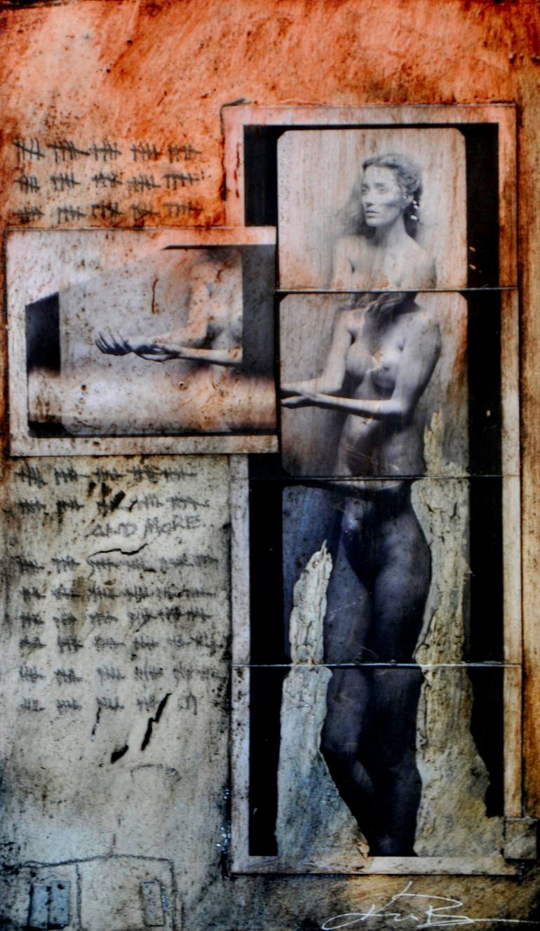 The image is of a friend photographed with multiple Polaroids and bonded to a custom made panel with text added. The style and technique is one I developed many years ago called the "OilGraph" which is a hybrid of traditional BW photography and oil paint.
