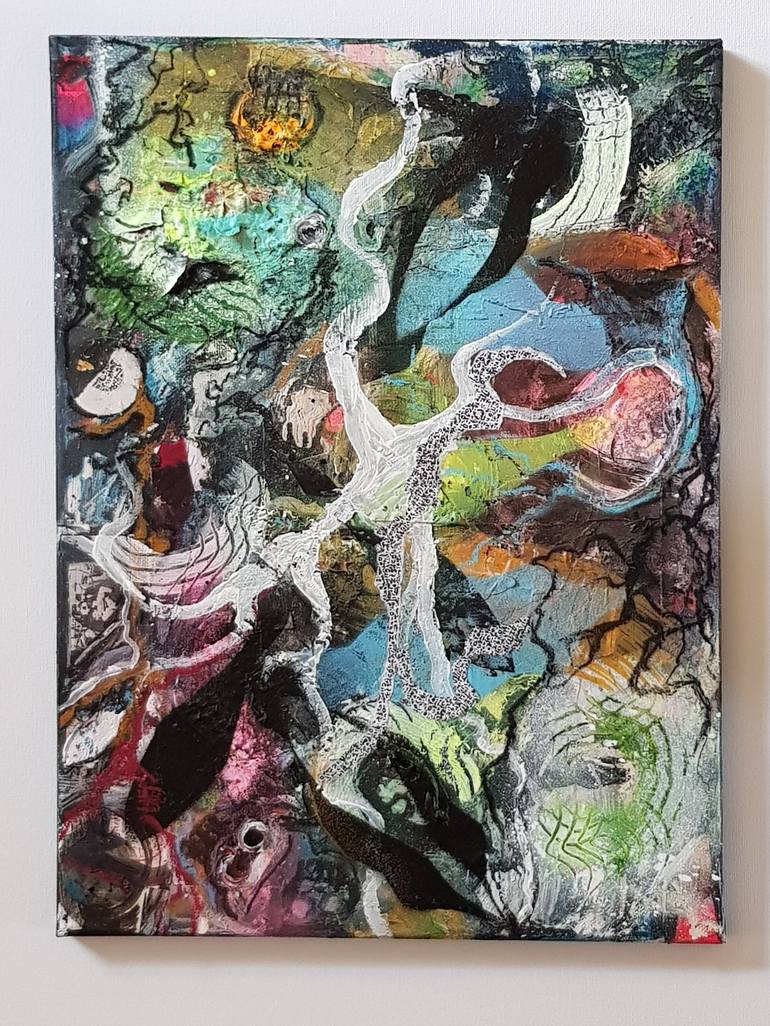 Artist Sarah is a mixed media artist working from her studio in Kent. She makes both large and small scale work experimenting with each material deconstructing and transforming each medium and their rules into one. Sarah uses acrylic and oil paint mediums, found materials, selfmade collage fragments, foil leaf and other mixed media as a means of experimentation, playing with the ideas of space and process typically using portraiture, mythology or land/seascapes as inspiration and a starting point. Sarah does not look for a formula to reproduce but rather she immerses herself in her work with a constant curiosity and a sense of potential discovery.