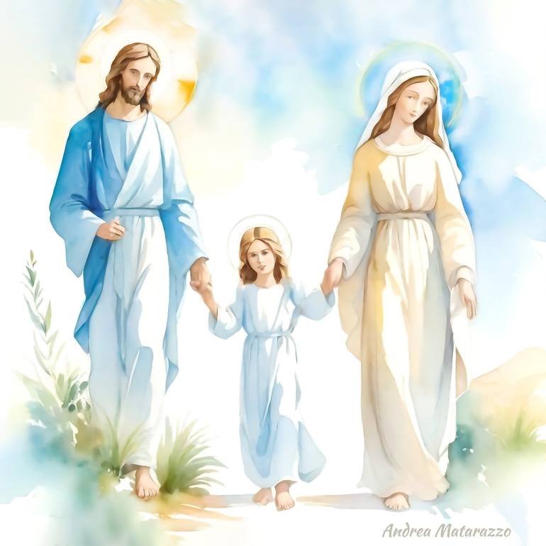 A delicate portrait of the Holy Family, with Saint Mary, the Child Jesus and St. Joseph. United by the hand, they walk together towards us to take us by the hand and walk with them in Peace, Hope and Faith. Computer graphic with painting, watercolor effect.