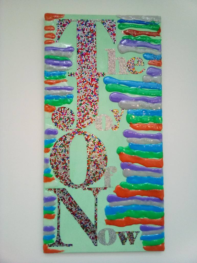 I started this work in 2021 during Covid when the mindfulness mantra of focusing on the now and not worrying about the future was a great help hence the wording. I work with beads but chose to use rhinestones because I wanted more sparkle.Originally it just had the stones but I added the resin in 20...
