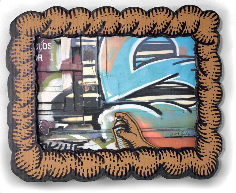 A mixed media mashup of closeup shots of freight car graffiti plus my own contributions, in a free form relief and painting style object. With cardboard graffiti style decorative frame. All of this series of works are hi-rez pigment digital archival prints laminated to acrylic primed, new tri-wall ...