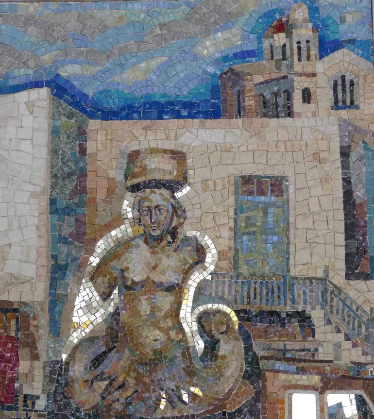 A mythic Siren is pictured guarding the entrance of an island set with white houses and churches with blue domes. According to the myth ,Sirens were sea creatures ,knowing its history and secrets .They formed a theatrical company of the sea like that of Dionysus .They were able to foresee the weath...