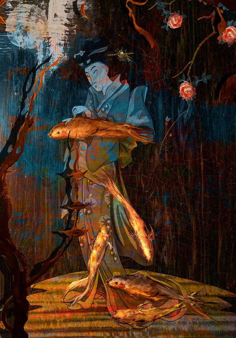 Coy Carp are described in Japanese culture as Living jewels. This image is a collage of painted images and photography on beautiful fine art paper. It I like my work to have a dream like quality.